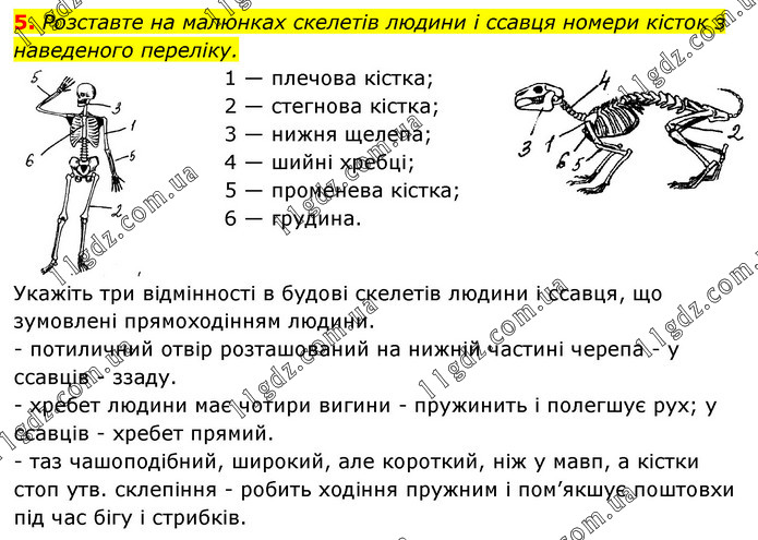 Розставте на малюнках скелетів людини і ссавця номери кісток з наведеного переліку. 1 — плечова кістка; 2 — стегнова кістка; 3 — нижня щелепа; 4 — шийні хребці; 5 — променева кістка; 6 — грудина. Укажіть три відмінності в будові скелетів людини і ссавця, що зумовлені прямоходінням людини. - потиличний отвір розташований на нижній частині черепа - у ссавців - ззаду. - хребет людини має чотири вигини - пружинить і полегшує рух; у ссавців - хребет прямий. - таз чашоподібний, широкий, але короткий, ніж у мавп, а кістки стоп утв. склепіння - робить ходіння пружним і пом’якшує поштовхи під час бігу і стрибків.