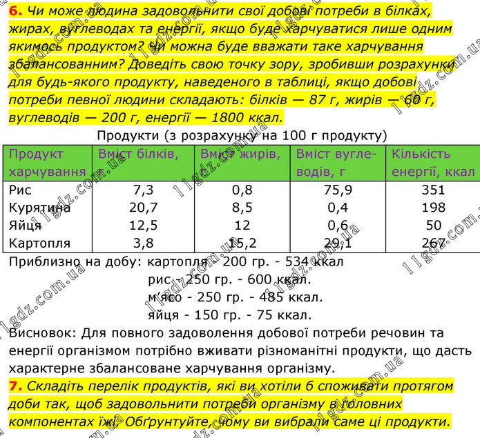 Чи може людина задовольнити свої добові потреби в білках, жирах, вуглеводах та енергії, якщо буде харчуватися лише одним якимось продуктом? Чи можна буде вважати таке харчування збалансованним? Доведіть свою точку зору, зробивши розрахунки для будь-якого продукту, наведеного в таблиці, якщо добові потреби певної людини складають: білків — 87 г, жирів — 60 г, вуглеводів — 200 г, енергії — 1800 ккал. Продукти (з розрахунку на 100 г продукту) Приблизно на добу: картопля - 200 гр. - 534 ккал рис - 250 гр. - 600 ккал. м’ясо - 250 гр. - 485 ккал. яйця - 150 гр. - 75 ккал. Висновок: Для повного задоволення добової потреби речовин та енергії організмом потрібно вживати різноманітні продукти, що дасть характерне збалансоване харчування організму. 7. Складіть перелік продуктів, які ви хотіли б споживати протягом доби так, щоб задовольнити потреби організму в головних компонентах їжі. Обґрунтуйте, чому ви вибрали саме ці продукти.