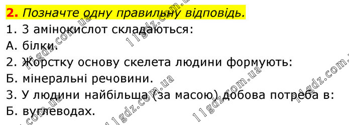 2. Позначте одну правильну відповідь. 1. 3 амінокислот складаються: А. білки. 2. Жорстку основу скелета людини формують: Б. мінеральні речовини. 3. У людини найбільша (за масою) добова потреба в: Б. вуглеводах.