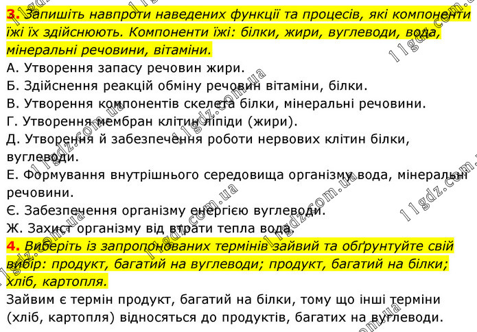 3. Запишіть навпроти наведених функції та процесів, які компоненти їжі їх здійснюють. Компоненти їжі: білки, жири, вуглеводи, вода, мінеральні речовини, вітаміни. А. Утворення запасу речовин жири. Б. Здійснення реакцій обміну речовин вітаміни, білки. В. Утворення компонентів скелета білки, мінеральні речовини. Г. Утворення мембран клітин ліпіди (жири). Д. Утворення й забезпечення роботи нервових клітин білки, вуглеводи. Е. Формування внутрішнього середовища організму вода, мінеральні речовини. Є. Забезпечення організму енергією вуглеводи. Ж. Захист організму від втрати тепла вода. 4. Виберіть із запропонованих термінів зайвий та обґрунтуйте свій вибір: продукт, багатий на вуглеводи; продукт, багатий на білки; хліб, картопля. Зайвим є термін продукт, багатий на білки, тому що інші терміни (хліб, картопля) відносяться до продуктів, багатих на вуглеводи.