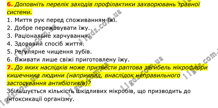 6. Доповніть перелік заходів профілактики захворювань травної системи. 1. Миття рук перед споживанням їжі. 2. Добре пережовувати їжу. 3. Раціональне харчування. 4. Здоровий спосіб життя. 5. Регулярне чищення зубів. 6. Вживати лише свіжі приготовлену їжу. 7. До яких наслідків може призвести раптова загибель мікрофлори кишечника людини (наприклад, внаслідок неправильного застосування антибіотиків)? Збільшується кількість шкідливих мікробів, що призводить до інтоксикації організму.