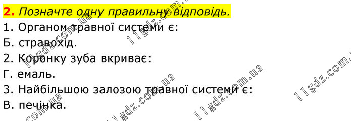 2. Позначте одну правильну відповідь. 1. Органом травної системи є: Б. стравохід. 2. Коронку зуба вкриває: Г. емаль. 3. Найбільшою залозою травної системи є: В. печінка.