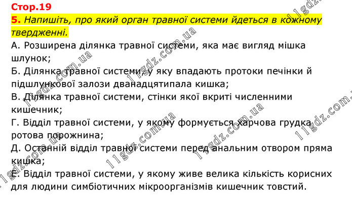 Напишіть, про який орган травної системи йдеться в кожному твердженні. А. Розширена ділянка травної системи, яка має вигляд мішка шлунок; Б. Ділянка травної системи, у яку впадають протоки печінки й підшлункової залози дванадцятипала кишка; В. Ділянка травної системи, стінки якої вкриті численними кишечник; Г. Відділ травної системи, у якому формується харчова грудка ротова порожнина; Д. Останній відділ травної системи перед анальним отвором пряма кишка; Е. Відділ травної системи, у якому живе велика кількість корисних для людини симбіотичних мікроорганізмів кишечник товстий.