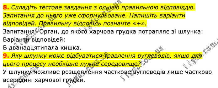 8. Складіть тестове завдання з однією правильною відповіддю. Запитання до нього уже сформульоване. Напишіть варіанти відповідей. Правильну відповідь позначте «+». Запитання: Орган, до якого харчова грудка потрапляє зі шлунка: Варіанти відповідей: В дванадцятипала кишка. 9. Яку шлунку може відбуватися травлення вуглеводів, якщо для цього процесу необхідне лужне середовище? У шлунку можливе розщеплення часткове вуглеводів лише частково всередині харчової грудки.