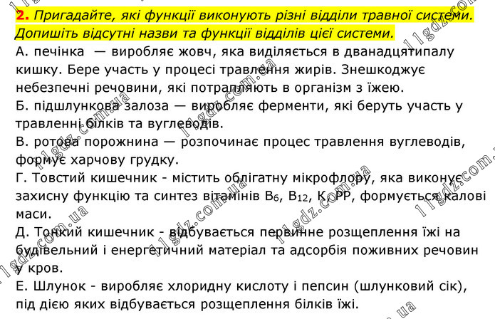 Пригадайте, які функції виконують різні відділи травної системи. Допишіть відсутні назви та функції відділів цієї системи. А. печінка — виробляє жовч, яка виділяється в дванадцятипалу кишку. Бере участь у процесі травлення жирів. Знешкоджує небезпечні речовини, які потрапляють в організм з їжею. Б. підшлункова залоза — виробляє ферменти, які беруть участь у травленні білків та вуглеводів. В. ротова порожнина — розпочинає процес травлення вуглеводів, формує харчову грудку. Г. Товстий кишечник - містить облігатну мікрофлору, яка виконує захисну функцію та синтез вітамінів В6, В12, К, РР, формується калові маси. Д. Тонкий кишечник - відбувається первинне розщеплення їжі на будівельний і енергетичний матеріал та адсорбія поживних речовин у кров. Е. Шлунок - виробляє хлоридну кислоту і пепсин (шлунковий сік), під дією яких відбувається розщеплення білків їжі.