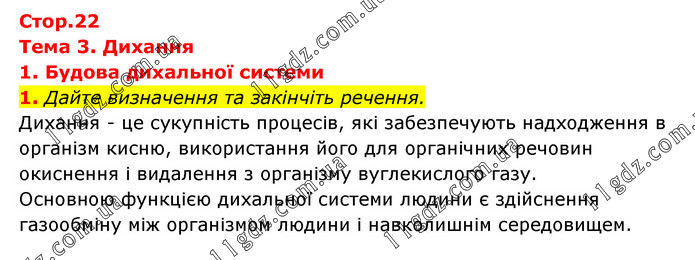 Тема 3. Дихання 1. Будова дихальної системи 1. Дайте визначення та закінчіть речення. Дихання - це сукупність процесів, які забезпечують надходження в організм кисню, використання його для органічних речовин окиснення і видалення з організму вуглекислого газу. Основною функцією дихальної системи людини є здійснення газообміну між організмом людини і навколишнім середовищем.