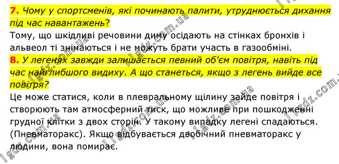 7. Чому у спортсменів, які починають палити, утруднюється дихання під час навантажень? Тому, що шкідливі речовини диму осідають на стінках бронхів і альвеол ті знімаються і не можуть брати участь в газообміні. 8. У легенях завжди залишається певний об'єм повітря, навіть під час найглибшого видиху. А що станеться, якщо з легень вийде все повітря? Це може статися, коли в плевральному щілину зайде повітря і створюють там атмосферний тиск, що можливе при пошкодженні грудної клітки з двох сторін. У такому випадку легені спадаються. (Пневматоракс). Якщо відбувається двобічний пневматоракс у людини, вона помирає.