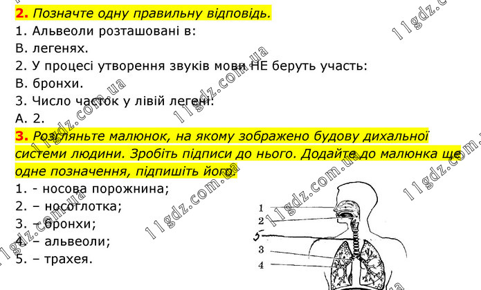 2. Позначте одну правильну відповідь. 1. Альвеоли розташовані в: В. легенях. 2. У процесі утворення звуків мови НЕ беруть участь: В. бронхи. 3. Число часток у лівій легені: А. 2. 3. Розгляньте малюнок, на якому зображено будову дихальної системи людини. Зробіть підписи до нього. Додайте до малюнка ще одне позначення, підпишіть його. 1. - носова порожнина; 2. – носоглотка; 3. – бронхи; 4. – альвеоли; 5. – трахея.