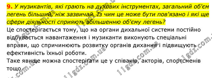 У музикантів, які грають на духових інструментах, загальний об'єм легень більший, ніж зазвичай. Із чим це може бути пов'язано і які ще сфери діяльності сприяють збільшенню об'єму легень? Це спостерігається тому, що на органи дихальної системи постійно відбувається навантаження і музиканти виконують спеціальні вправи, що спричинюють розвитку органів дихання і підвищують ефективність їхньої роботи. Таке явище можна спостерігати це у співаків, акторів, спортсменів тощо.