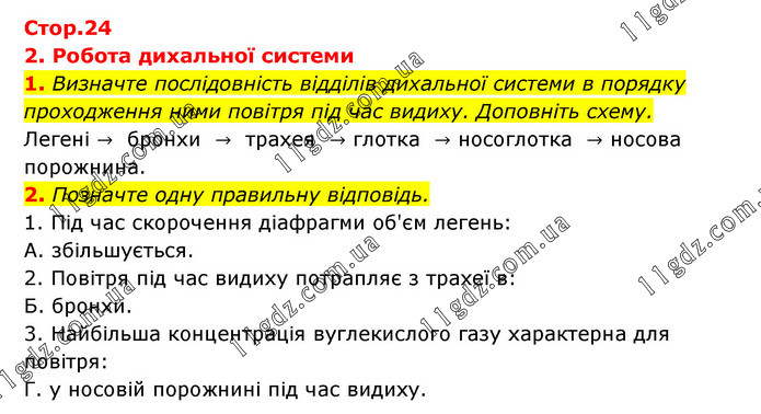 2. Робота дихальної системи 1. Визначте послідовність відділів дихальної системи в порядку проходження ними повітря під час видиху. Доповніть схему. Легені → бронхи → трахея → глотка → носоглотка → носова порожнина. 2. Позначте одну правильну відповідь. 1. Під час скорочення діафрагми об'єм легень: А. збільшується. 2. Повітря під час видиху потрапляє з трахеї в: Б. бронхи. 3. Найбільша концентрація вуглекислого газу характерна для повітря: Г. у носовій порожнині під час видиху.