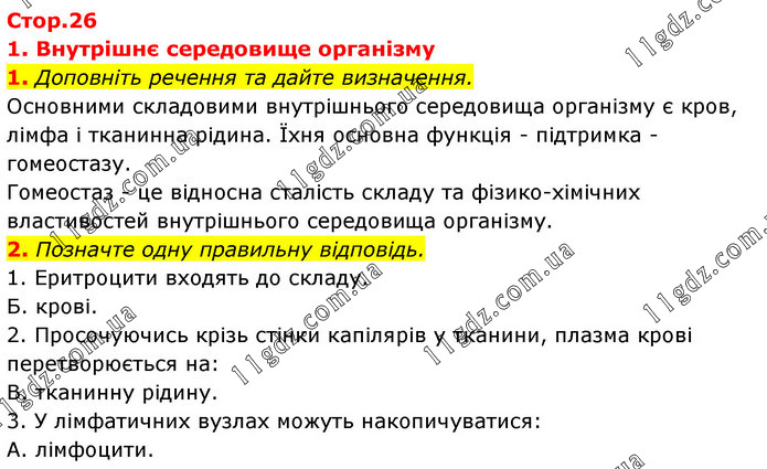 1. Внутрішнє середовище організму 1. Доповніть речення та дайте визначення. Основними складовими внутрішнього середовища організму є кров, лімфа і тканинна рідина. Їхня основна функція - підтримка - гомеостазу. Гомеостаз - це відносна сталість складу та фізико-хімічних властивостей внутрішнього середовища організму. 2. Позначте одну правильну відповідь. 1. Еритроцити входять до складу. Б. крові. 2. Просочуючись крізь стінки капілярів у тканини, плазма крові перетворюється на: В. тканинну рідину. 3. У лімфатичних вузлах можуть накопичуватися: А. лімфоцити.