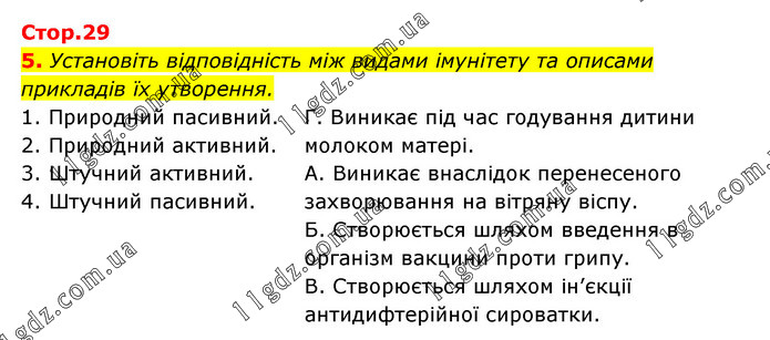 Установіть відповідність між видами імунітету та описами прикладів їх утворення. 1. Природний пасивний. 2. Природний активний. 3. Штучний активний. 4. Штучний пасивний. Г. Виникає під час годування дитини молоком матері. А. Виникає внаслідок перенесеного захворювання на вітряну віспу. Б. Створюється шляхом введення в організм вакцини проти грипу. В. Створюється шляхом ін’єкції антидифтерійної сироватки.