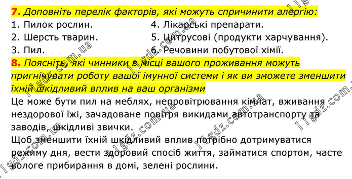 7. Доповніть перелік факторів, які можуть спричинити алергію: 1. Пилок рослин. 2. Шерсть тварин. 3. Пил. 4. Лікарські препарати. 5. Цитрусові (продукти харчування). 6. Речовини побутової хімії. 8. Поясніть, які чинники в місці вашого проживання можуть пригнічувати роботу вашої імунної системи і як ви зможете зменшити їхній шкідливий вплив на ваш організми Це може бути пил на меблях, непровітрювання кімнат, вживання нездорової їжі, зачадоване повітря викидами автотранспорту та заводів, шкідливі звички. Щоб зменшити їхній шкідливий вплив потрібно дотримуватися режиму дня, вести здоровий спосіб життя, займатися спортом, часте вологе прибирання в домі, зелені рослини.