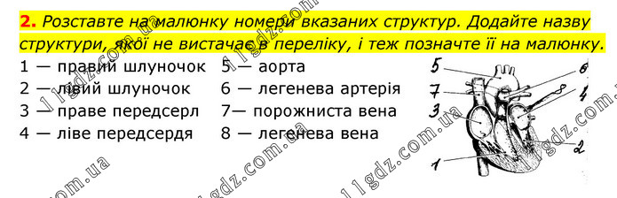 Розставте на малюнку номери вказаних структур. Додайте назву структури, якої не вистачає в переліку, і теж позначте її на малюнку. 1 — правий шлуночок 2 — лівий шлуночок 3 — праве передсерл 4 — ліве передсердя 5 — аорта 6 — легенева артерія 7— порожниста вена 8 — легенева вена