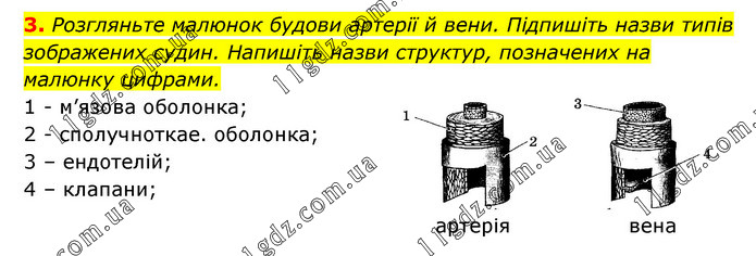 Розгляньте малюнок будови артерії й вени. Підпишіть назви типів зображених судин. Напишіть назви структур, позначених на малюнку цифрами. 1 - м’язова оболонка; 2 - сполучноткае. оболонка; 3 – ендотелій; 4 – клапани;