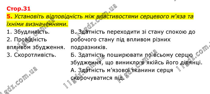 Установіть відповідність між властивостями серцевого м'яза та їхніми визначеннями. 1. Збудливість. 2. Провідність впливом збудження. 3. Скоротливість. В. Здатність переходити зі стану спокою до робочого стану під впливом різних подразників. Б. Здатність поширювати по всьому серцю збудження, що виникло в якійсь його ділянці. А. Здатність м’язової тканини серця скорочуватися під.