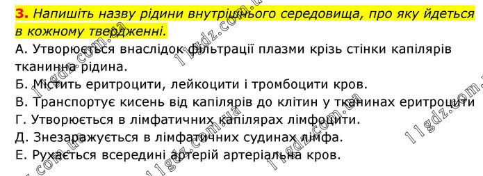 Напишіть назву рідини внутрішнього середовища, про яку йдеться в кожному твердженні. А. Утворюється внаслідок фільтрації плазми крізь стінки капілярів тканинна рідина. Б. Містить еритроцити, лейкоцити і тромбоцити кров. В. Транспортує кисень від капілярів до клітин у тканинах еритроцити Г. Утворюється в лімфатичних капілярах лімфоцити. Д. Знезаражується в лімфатичних судинах лімфа. Е. Рухається всередині артерій артеріальна кров.