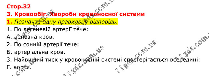 3. Кровообіг. Хвороби кровоносної системи 1. Позначте одну правильну відповідь. 1. По легеневій артерії тече: А. венозна кров. 2. По сонній артерії тече: Б. артеріальна кров. 3. Найвищий тиск у кровоносній системі спостерігається всередині: Г. аорти.