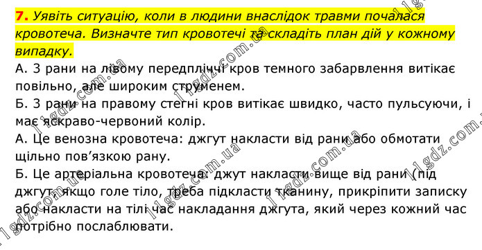 Уявіть ситуацію, коли в людини внаслідок травми почалася кровотеча. Визначте тип кровотечі та складіть план дій у кожному випадку. А. 3 рани на лівому передпліччі кров темного забарвлення витікає повільно, але широким струменем. Б. 3 рани на правому стегні кров витікає швидко, часто пульсуючи, і має яскраво-червоний колір. А. Це венозна кровотеча: джгут накласти від рани або обмотати щільно пов’язкою рану. Б. Це артеріальна кровотеча: джут накласти вище від рани (під джгут, якщо голе тіло, треба підкласти тканину, прикріпити записку або накласти на тілі час накладання джгута, який через кожний час потрібно послаблювати.