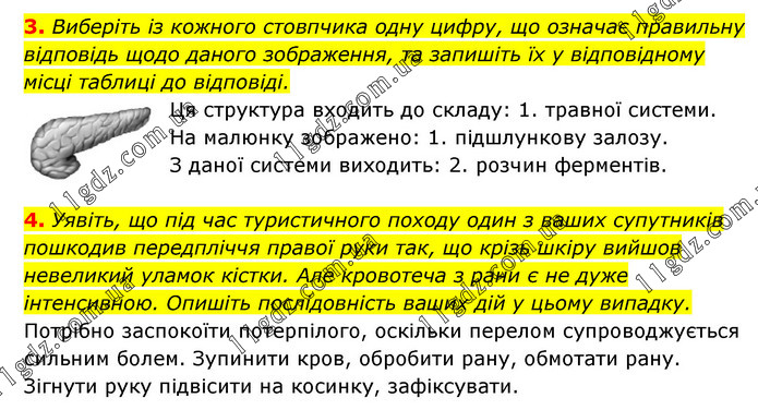3. Виберіть із кожного стовпчика одну цифру, що означає правильну відповідь щодо даного зображення, та запишіть їх у відповідному місці таблиці до відповіді. Ця структура входить до складу: 1. травної системи. На малюнку зображено: 1. підшлункову залозу. З даної системи виходить: 2. розчин ферментів. 4. Уявіть, що під час туристичного походу один з ваших супутників пошкодив передпліччя правої руки так, що крізь шкіру вийшов невеликий уламок кістки. Але кровотеча з рани є не дуже інтенсивною. Опишіть послідовність ваших дій у цьому випадку. Потрібно заспокоїти потерпілого, оскільки перелом супроводжується сильним болем. Зупинити кров, обробити рану, обмотати рану. Зігнути руку підвісити на косинку, зафіксувати.