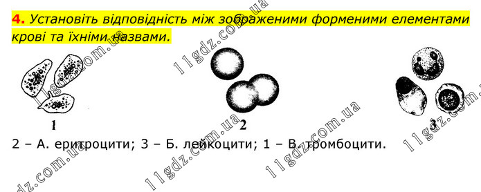 Установіть відповідність між зображеними форменими елементами крові та їхніми назвами. 2 – А. еритроцити; 3 – Б. лейкоцити; 1 – В. тромбоцити.