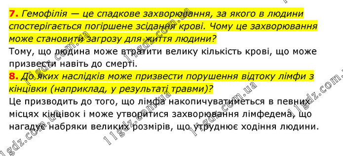 7. Гемофілія — це спадкове захворювання, за якого в людини спостерігається погіршене зсідання крові. Чому це захворювання може становити загрозу для життя людини? Тому, що людина може втратити велику кількість крові, що може призвести навіть до смерті. 8. До яких наслідків може призвести порушення відтоку лімфи з кінцівки (наприклад, у результаті травми)? Це призводить до того, що лімфа накопичуватиметься в певних місцях кінцівок і може утворитися захворювання лімфедема, що нагадує набряки великих розмірів, що утруднює ходіння людини.