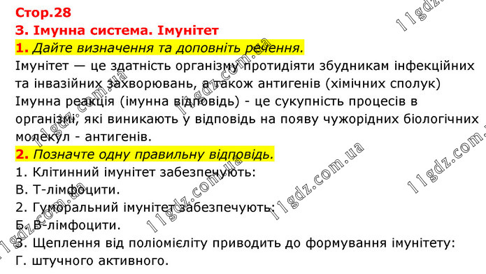 З. Імунна система. Імунітет 1. Дайте визначення та доповніть речення. Імунітет — це здатність організму протидіяти збудникам інфекційних та інвазійних захворювань, а також антигенів (хімічних сполук) Імунна реакція (імунна відповідь) - це сукупність процесів в організмі, які виникають у відповідь на появу чужорідних біологічних молекул - антигенів. 2. Позначте одну правильну відповідь. 1. Клітинний імунітет забезпечують: В. Т-лімфоцити. 2. Гуморальний імунітет забезпечують: Б. В-лімфоцити. 3. Щеплення від поліомієліту приводить до формування імунітету: Г. штучного активного.