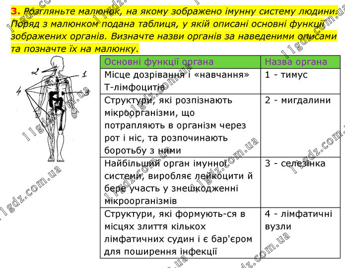 Розгляньте малюнок, на якому зображено імунну систему людини. Поряд з малюнком подана таблиця, у якій описані основні функції зображених органів. Визначте назви органів за наведеними описами та позначте їх на малюнку. Основні функції органа Назва органа Місце дозрівання і «навчання» Т-лімфоцитів 1 - тимус Структури, які розпізнають мікроорганізми, що потрапляють в організм через рот і ніс, та розпочинають боротьбу з ними 2 - мигдалини Найбільший орган імунної системи, виробляє лейкоцити й бере участь у знешкодженні мікроорганізмів 3 - селезінка Структури, які формують-ся в місцях злиття кількох лімфатичних судин і є бар'єром для поширення інфекції 4 - лімфатичні вузли
