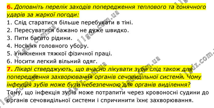 6. Доповніть перелік заходів попередження теплового та сонячного ударів за жаркої погоди: 1. Слід старатися більше перебувати в тіні. 2. Пересуватися бажано не дуже швидко. 3. Пити багато рідини. 4. Носіння головного убору. 5. Уникнення тяжкої фізичної праці. 6. Носити легкий вільний одяг. 7. Лікарі стверджують, що вчасно лікувати зуби слід також для попередження захворювання органів сечовидільної системи. Чому інфекція зубів може бути небезпечною для органів виділення? Тому, що інфекція зубів може потрапити через кровоносні судини до органів сечовидільної системи і спричинити їхнє захворювання.