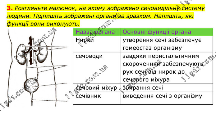 Розгляньте малюнок, на якому зображено сечовидільну систему людини. Підпишіть зображені органи за зразком. Напишіть, які функції вони виконують.