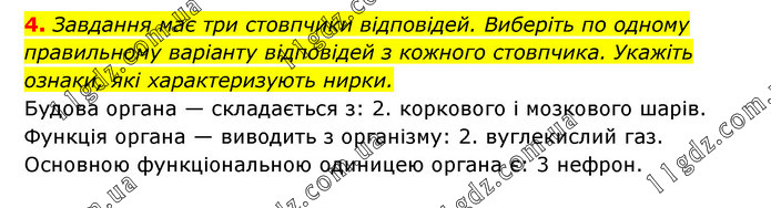 Завдання має три стовпчики відповідей. Виберіть по одному правильному варіанту відповідей з кожного стовпчика. Укажіть ознаки, які характеризують нирки. Будова органа — складається з: 2. коркового і мозкового шарів. Функція органа — виводить з організму: 2. вуглекислий газ. Основною функціональною одиницею органа є: 3 нефрон.
