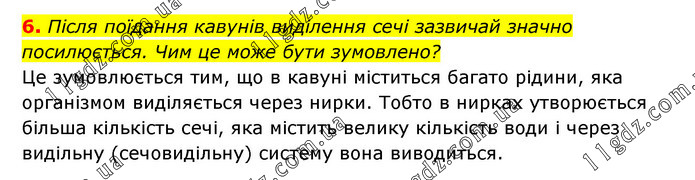 Після поїдання кавунів виділення сечі зазвичай значно посилюється. Чим це може бути зумовлено? Це зумовлюється тим, що в кавуні міститься багато рідини, яка організмом виділяється через нирки. Тобто в нирках утворюється більша кількість сечі, яка містить велику кількість води і через видільну (сечовидільну) систему вона виводиться.