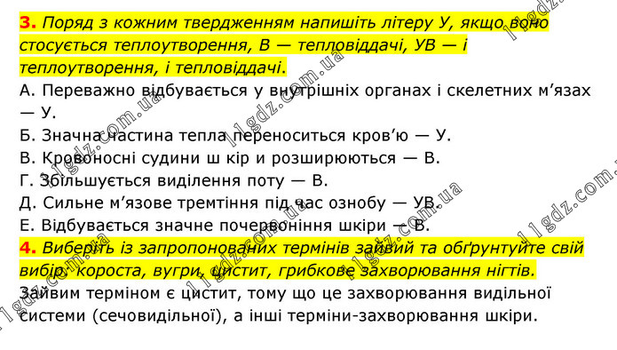 3. Поряд з кожним твердженням напишіть літеру У, якщо воно стосується теплоутворення, В — тепловіддачі, УВ — і теплоутворення, і тепловіддачі. А. Переважно відбувається у внутрішніх органах і скелетних м’язах — У. Б. Значна частина тепла переноситься кров’ю — У. В. Кровоносні судини ш кір и розширюються — В. Г. Збільшується виділення поту — В. Д. Сильне м’язове тремтіння під час ознобу — УВ. Е. Відбувається значне почервоніння шкіри — В. 4. Виберіть із запропонованих термінів зайвий та обґрунтуйте свій вибір: короста, вугри, цистит, грибкове захворювання нігтів. Зайвим терміном є цистит, тому що це захворювання видільної системи (сечовидільної), а інші терміни-захворювання шкіри.