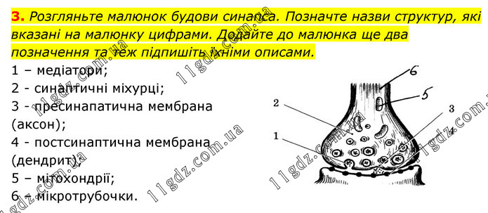 Розгляньте малюнок будови синапса. Позначте назви структур, які вказані на малюнку цифрами. Додайте до малюнка ще два позначення та теж підпишіть їхніми описами. 1 – медіатори; 2 - синаптичні міхурці; 3 - пресинапатична мембрана (аксон); 4 - постсинаптична мембрана (дендрит); 5 – мітохондрії; 6 – мікротрубочки.