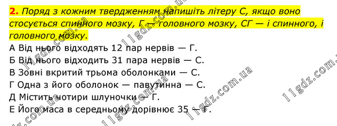Поряд з кожним твердженням напишіть літеру С, якщо воно стосується спинного мозку, Г — головного мозку, СГ — і спинного, і головного мозку. А Від нього відходять 12 пар нервів — Г. Б Від нього відходить 31 пара нервів — С. В Зовні вкритий трьома оболонками — С. Г Одна з його оболонок — павутинна — С. Д Містить чотири шлуночки — Г. Е Його маса в середньому дорівнює 35 — Г.