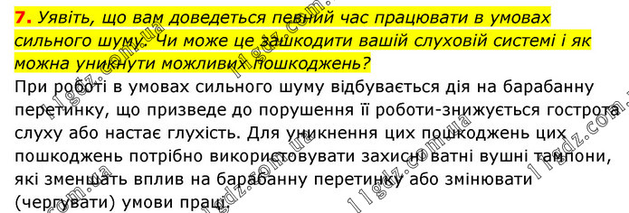 Уявіть, що вам доведеться певний час працювати в умовах сильного шуму. Чи може це зашкодити вашій слуховій системі і як можна уникнути можливих пошкоджень? При роботі в умовах сильного шуму відбувається дія на барабанну перетинку, що призведе до порушення її роботи-знижується гострота слуху або настає глухість. Для уникнення цих пошкоджень цих пошкоджень потрібно використовувати захисні ватні вушні тампони, які зменшать вплив на барабанну перетинку або змінювати (чергувати) умови праці.