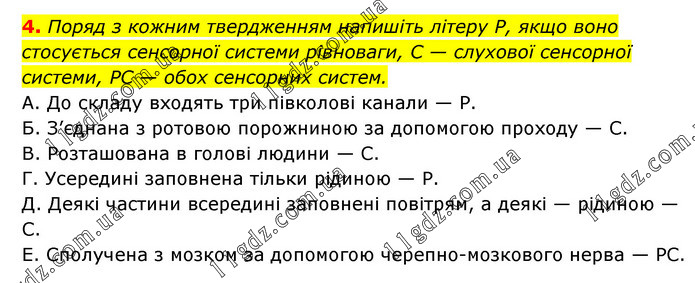 4. Поряд з кожним твердженням напишіть літеру Р, якщо воно стосується сенсорної системи рівноваги, С — слухової сенсорної системи, РС — обох сенсорних систем. А. До складу входять три півколові канали — Р. Б. З’єднана з ротовою порожниною за допомогою проходу — С. В. Розташована в голові людини — С. Г. Усередині заповнена тільки рідиною — Р. Д. Деякі частини всередині заповнені повітрям, а деякі — рідиною — С. Е. Сполучена з мозком за допомогою черепно-мозкового нерва — РС.