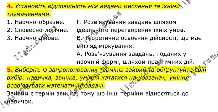 4. Установіть відповідність між видами мислення та їхніми тлумаченнями. 1. Наочно-образне. 2. Словесно-логічне. 3. Наочно-дійове. Г. Розв’язування завдань шляхом ідеального перетворення їхніх умов. В. Теоретичне освоєння дійсності, що має вигляд міркування. А. Розв’язування завдань, поданих у наочній формі, шляхом практичних дій. 5. Виберіть із запропонованих термінів зайвий та обґрунтуйте свій вибір: навичка, звичка, уміння кататися на ковзанах, уміння розв'язувати математичні задачі. Зайвим є термін звичка, тому що інші терміни відносяться до навичок.