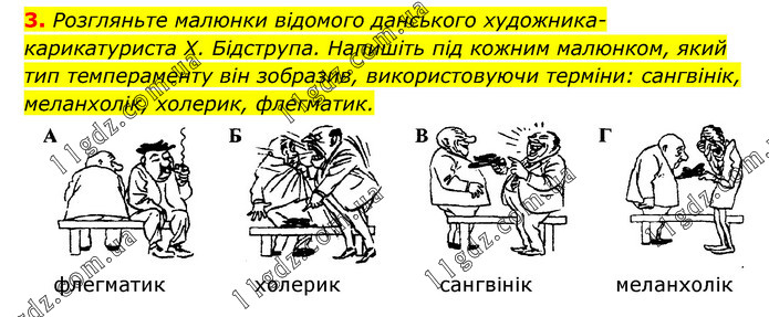Розгляньте малюнки відомого данського художника-карикатуриста X. Бідструпа. Напишіть під кожним малюнком, який тип темпераменту він зобразив, використовуючи терміни: сангвінік, меланхолік, холерик, флегматик.