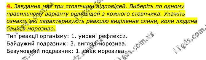 Завдання має три стовпчики відповідей. Виберіть по одному правильному варіанту відповідей з кожного стовпчика. Укажіть ознаки, які характеризують реакцію виділення слини, коли людина бачить морозиво. Тип реакції організму: 1. умовні рефлекси. Байдужий подразник: 3. вигляд морозива. Безумовний подразник: 1. смак морозива.