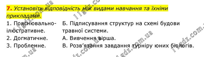 Установіть відповідність між видами навчання та їхніми прикладами. 1. Пояснювально-ілюстративне. 2. Догматичне. 3. Проблемне. Б. Підписування структур на схемі будови травної системи. А. Вивчення вірша. В. Розв’язання завдання турніру юних біологів.
