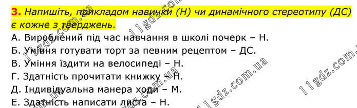 Напишіть, прикладом навички (Н) чи динамічного стереотипу (ДС) є кожне з тверджень. А. Вироблений під час навчання в школі почерк – Н. Б. Уміння готувати торт за певним рецептом – ДС. В. Уміння їздити на велосипеді – Н. Г. Здатність прочитати книжку – Н. Д. Індивідуальна манера ходи – М. Е. Здатність написати листа – Н.