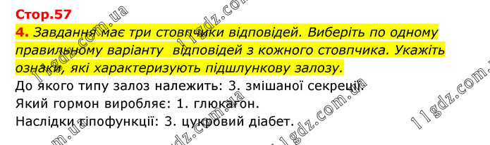 Завдання має три стовпчики відповідей. Виберіть по одному правильному варіанту відповідей з кожного стовпчика. Укажіть ознаки, які характеризують підшлункову залозу. До якого типу залоз належить: 3. змішаної секреції. Який гормон виробляє: 1. глюкагон. Наслідки гіпофункції: 3. цукровий діабет.