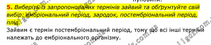 Виберіть із запропонованих термінів зайвий та обґрунтуйте свій вибір: ембріональний період, зародок, постембріональний період, плід. Зайвим є термін постембріональний період, тому що всі інші терміни належать до ембріонального організму.