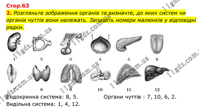 2. Розгляньте зображення органів та визначте, до яких систем чи органів чуттів вони належать. Запишіть номери малюнків у відповідні рядки. Ендокринна система: 8, 5. Видільна система: 1, 4, 12. Органи чуттів : 7, 10, 6, 2.