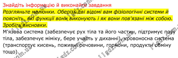 Знайдіть інформацію й виконайте завдання Розгляньте малюнки. Оберіть дві відомі вам фізіологічні системи й поясніть, які функції вони виконують і як вони пов'язані між собою. Зробіть висновки. М’язова система (забезпечує рух тіла та його частин, підтримує позу тіла, забезпечує міміку, бере участь у диханні), кровоносна система (транспортує кисень, поживні речовини, гормони, продукти обміну тощо).