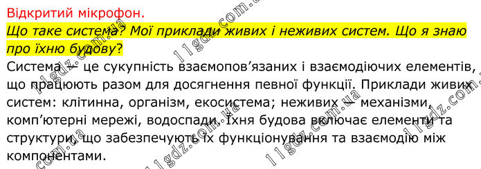 Відкритий мікрофон. Що таке система? Мої приклади живих і неживих систем. Що я знаю про їхню будову? Система — це сукупність взаємопов’язаних і взаємодіючих елементів, що працюють разом для досягнення певної функції. Приклади живих систем: клітинна, організм, екосистема; неживих — механізми, комп’ютерні мережі, водоспади. Їхня будова включає елементи та структури, що забезпечують їх функціонування та взаємодію між компонентами.