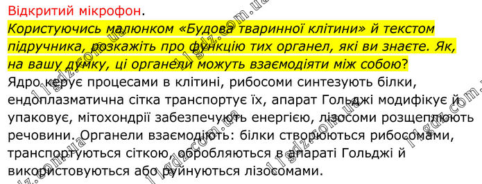 Відкритий мікрофон. Користуючись малюнком «Будова тваринної клітини» й текстом підручника, розкажіть про функцію тих органел, які ви знаєте. Як, на вашу думку, ці органели можуть взаємодіяти між собою? Ядро керує процесами в клітині, рибосоми синтезують білки, ендоплазматична сітка транспортує їх, апарат Гольджі модифікує й упаковує, мітохондрії забезпечують енергією, лізосоми розщеплюють речовини. Органели взаємодіють: білки створюються рибосомами, транспортуються сіткою, обробляються в апараті Гольджі й використовуються або руйнуються лізосомами.