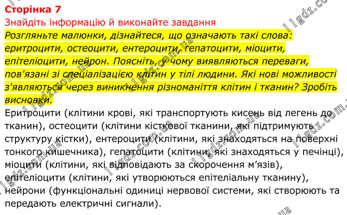 Знайдіть інформацію й виконайте завдання Розгляньте малюнки, дізнайтеся, що означають такі слова: еритроцити, остеоцити, ентероцити, гепатоцити, міоцити, епітеліоцити, нейрон. Поясніть, у чому виявляються переваги, пов'язані зі спеціалізацією клітин у тілі людини. Які нові можливості з'являються через виникнення різноманіття клітин і тканин? Зробіть висновки. Еритроцити (клітини крові, які транспортують кисень від легень до тканин), остеоцити (клітини кісткової тканини, які підтримують структуру кістки), ентероцити (клітини, які знаходяться на поверхні тонкого кишечника), гепатоцити (клітини, які знаходяться у печінці), міоцити (клітини, які відповідають за скорочення м’язів), епітеліоцити (клітини, які утворюються епітеліальну тканину), нейрони (функціональні одиниці нервової системи, які створюють та передають електричні сигнали).