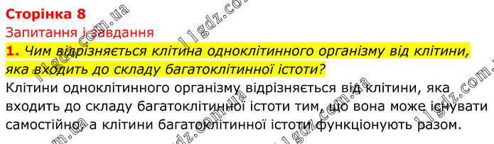Запитання і завдання 1. Чим відрізняється клітина одноклітинного організму від клітини, яка входить до складу багатоклітинної істоти? Клітини одноклітинного організму відрізняється від клітини, яка входить до складу багатоклітинної істоти тим, що вона може існувати самостійно, а клітини багатоклітинної істоти функціонують разом.